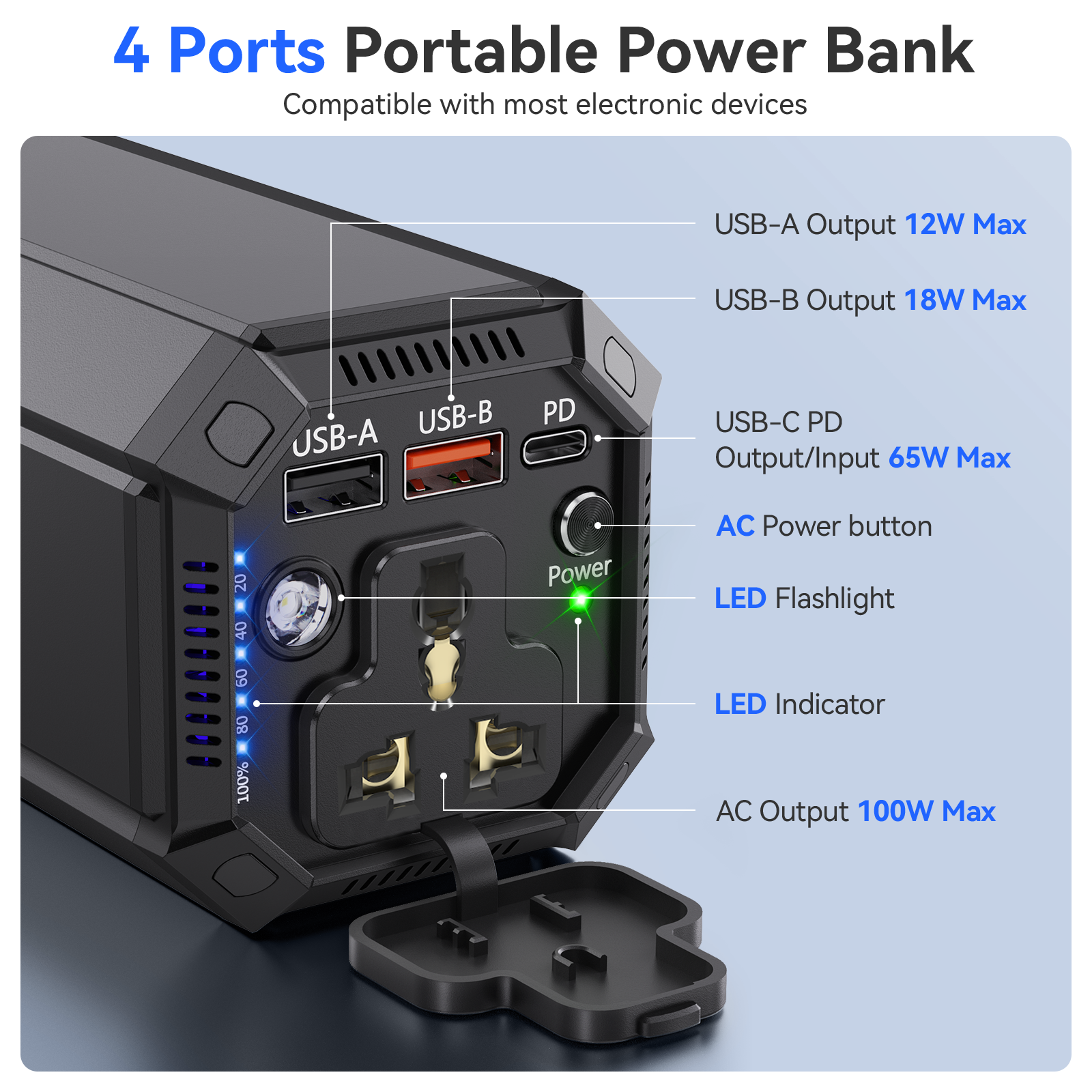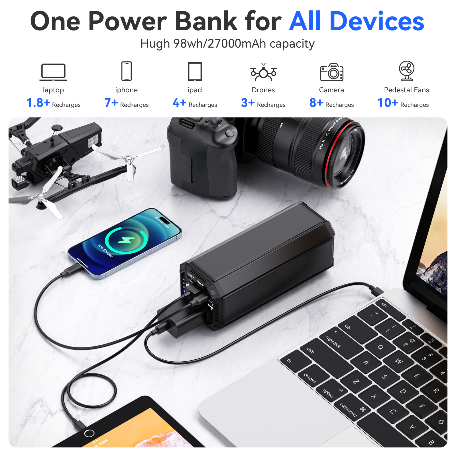 Huge 27000mAh Capacity: This power bank has a capacity of 27000mAh and four output ports for your emergency needs. There's a 100W AC port, a 65W PD Type-C port, a 12W USB port, and an 18W USB port for all your charging needs. You can charge your laptop, phone, tablet, camera, etc.